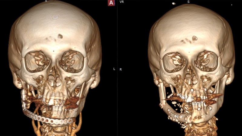 Bir il yarım əvvəl pasiyentə baş-boyun nahiyəsində yerləşən geniş yayılmış bədxassəli törəmə səbəbilə aşağı çənənin yarısı çıxarılmış və onun yerinə titan konstruksiya yerləşdirilib. Müasir tibbi texnologiyaların tətbiqi sayəsində həyata keçirilən son əməliyyat zamanı əvvəlcədən qoyulmuş titan lövhə çıxarılıb, aşağı çənənin yarısı pasiyentin öz sümüyü — fibula (incik sümüyü) vasitəsilə yenidən qurulub.