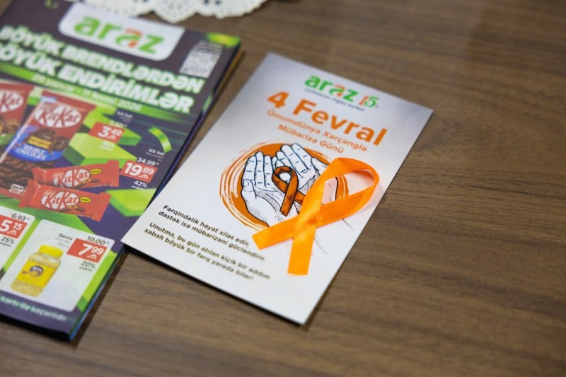 4 Fevral – Ümumdünya Xərçənglə Mübarizə Günü münasibətilə Veysəloğlu Şirkətlər Qrupuna daxil olan “Araz” supermarketlər şəbəkəsi tərəfindən “Araz Fərqindəlik Yaradır” şüarı altında “Xərçənglə Mübarizə Həftəsi” keçirilib. 4-11 fevral tarixlərində keçirilən maarifləndirici həftə çərçivəsində “Araz” supermarketlər şəbəkəsinin əməkdaşlarına narıncı yaxa nişanları təqdim olunub. Əməkdaşlar bu nişanları taxaraq xərçənglə mübarizə mövzusunda diqqət çəkib, həmrəylik nümayiş etdiriblər.