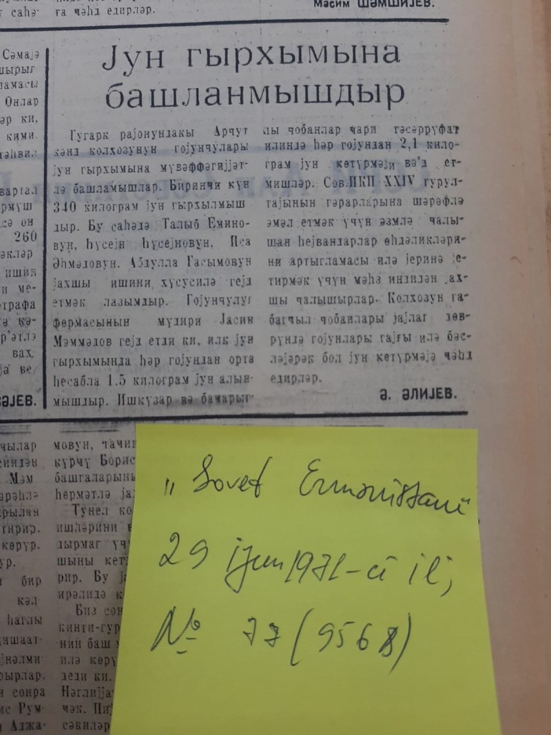 Eyniadlı qəzetin 29 iyun 1971-ci il tarixli, N77 (9568) sayında, Ə.Əliyevin imzası ilə dərc olunan “Yun qırxımına başlanmışdır”, məqalədə bu kimi sətirlərə rast gəlmək olur: “Quqark rayonundakı Arçut kənd kolxozunun qoyunçuları yun qırxımına müvəffəqiyyətlə başlamışlar. Birinci gün 340 kiloqram yun qırxılmışıdır. Bu sahədə Talıb Eminovun, Hüseyn Hüseynovun, İsa Əhmədovun, Abdulla Qasımovun yaxşı işini xüsusilə qeyd etmək lazımdır. Qoyunçuluq fermasının müdiri Yasin Məmmədov qeyd etdi ki, ilk yun qırxımında hər qoyundan orta hesabla 1.5 kiloqram yun alınmışdır. İşgüzar və bacarıqlı çobanlar cari təsərrüfat ilində hər qoyundan 2.1 kiloqram yun götürməyi vəd etmişlər. Sov.İKP XXIV qurultayının qərarlarına şərəflə əməl etmək üçün əzmlə çalışan heyvandarlar öhdəliklərini artıqlaması ilə yerinə yetirmək üçün məhz indidən yaxşı çalışırlar. Kolxozun qabaqcıl çobanları yaylaq dövründə qoyunları qayğı ilə bəsləyərək bol yun götürməyə cəhd edirlər”.