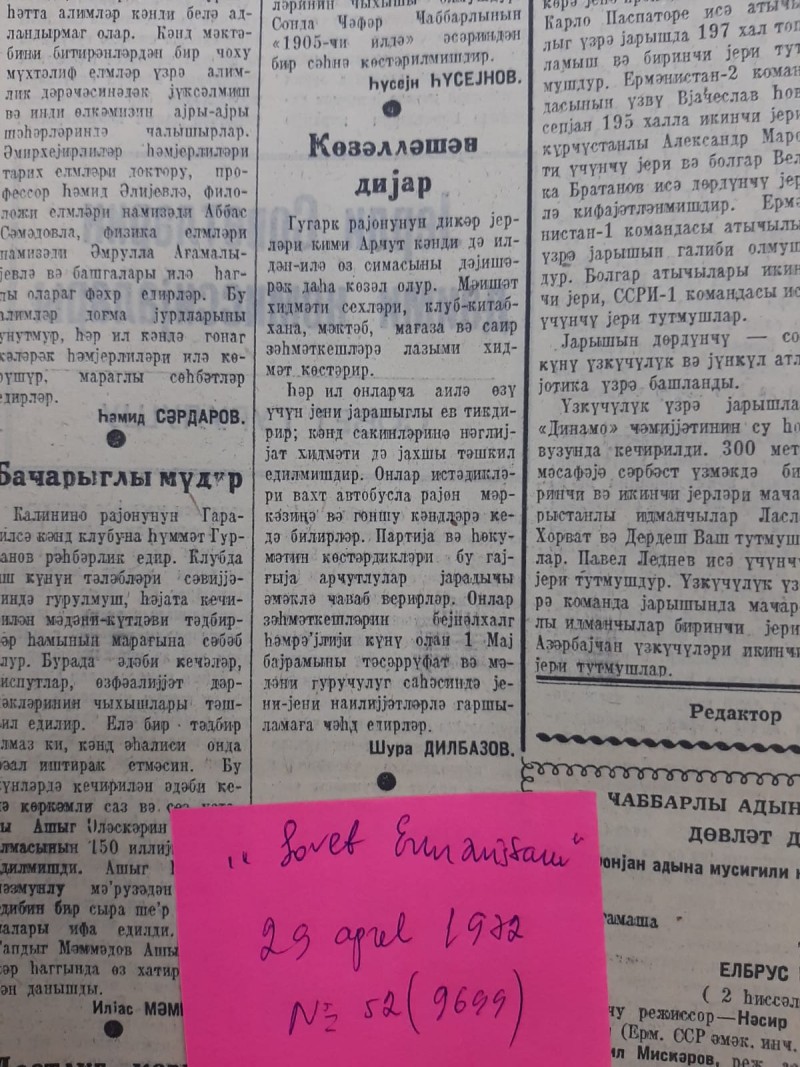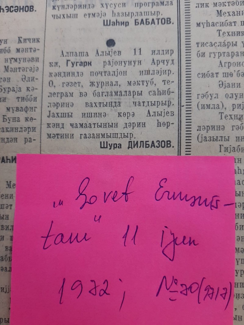 Qəzet özünün 11 iyun 1972-ci il tarixli, N70(9717) sayında, Şura Dilbazovun imzası ilə dərc olunan məqaləsində qeyd edirdi: “Alpaşa Alıyev 11 ildir ki, Quqark rayonunun Arcut kəndində poçtalyon işləyir. O, qəzet, jurnal, məktub, teleqram və bağlamaları sahiblərinə vaxtında çatdırır. Yaxşı işinə görə Alıyev kənd camaatının dərin hörmətni qızanmışdır”.
