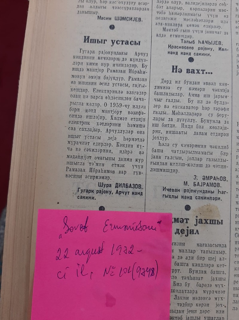 Qəzetin 22 avqust 1972-ci il tarixli, N101(9748) sayında, Şura Dilbazovun imzası ilə dərc olunan yazıda, “İşıq ustası”, başlıqlı məqalədə qeyd olunurdu: “Quqark rayonundakı Arcud kəndinin gecələri də gündüzləri kimi nur içindədir. Bu işdə mantyor Ramazan İbrahimovun əməyi böyükdür. Ramazan öz işinin əsil ustası, qayğıkeşdir. Elektriklə əlaqədar olan nə varsa öhdəsindən bacarıqla gəlir. O, 1959-cu ildən bəri kənd mantyoru vəzifəsində işləyir. Xidmət etdiyi elektrik xətlərini həmişə saz saxlayır. Arcudlular ona işıq ustası deyə hörmətlə müraciət edirlər. Kəndin küçə və səkilərini, idarə və mədəniyyət ocağını daimi gur işıqla təmin etmək üçün Ramazan İbrahimov var qüvvəsini əsirgəmir”.