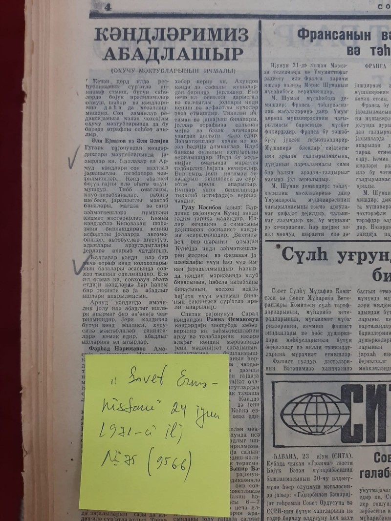 Qəzetin 31 may 1975-ci il tarixli, N65(10179) sayında, Şura Dilbazovun imzası ilə dərc olunan, “Maraqlı görüş”başlıqlı məqalədə yazılırdı: “Arcud kənd orta məktəbində bu günlərdə canlanma vardı. Müəllimlər, şagirdlər və kənd sakinləri əfsanəvi qəhrəman Mehdi Hüseynzadənin partizan dəstəsinin üzvü, gözəldərəli Məhər Məmmədovla görüşmək üçün toplaşmışdılar. M.Məmmədov öz xatirələrindən danışmışdır. Partizanların həyatından gətirdiyi epizodlar toplaşanların marağına səbəb olmuşdur. Görüşün sonunda şagirdlər Vətən haqqında yazılmış şerlərdən parçalar söyləmişlər. Özfəaliyyət dərnəyinin çıxışı olmuşdur. Hazırda məktəbdə ilaxırı imtahanlara hazırlıqla yanaşı, həm də vaxtaşırı mədəni-kütləvi tədbirlər həyata keçirilir”.