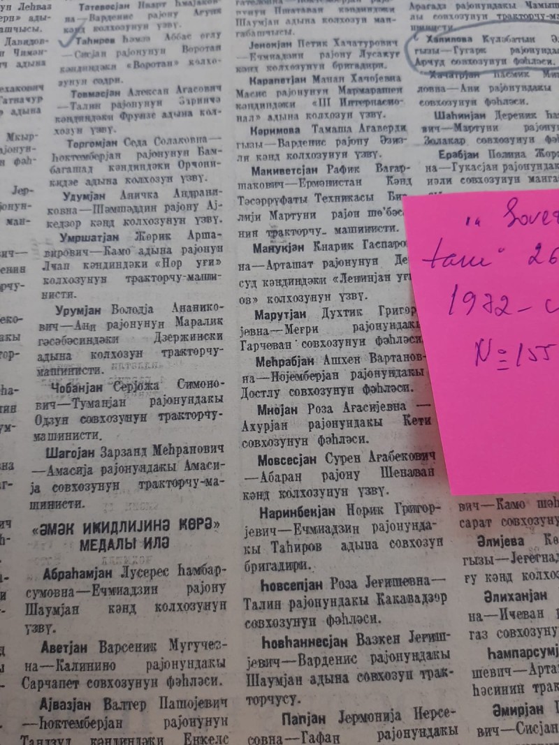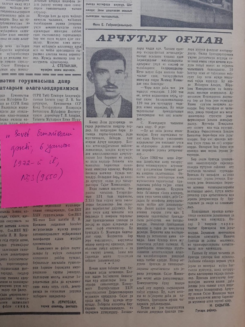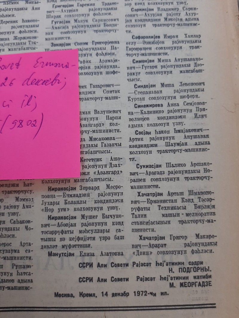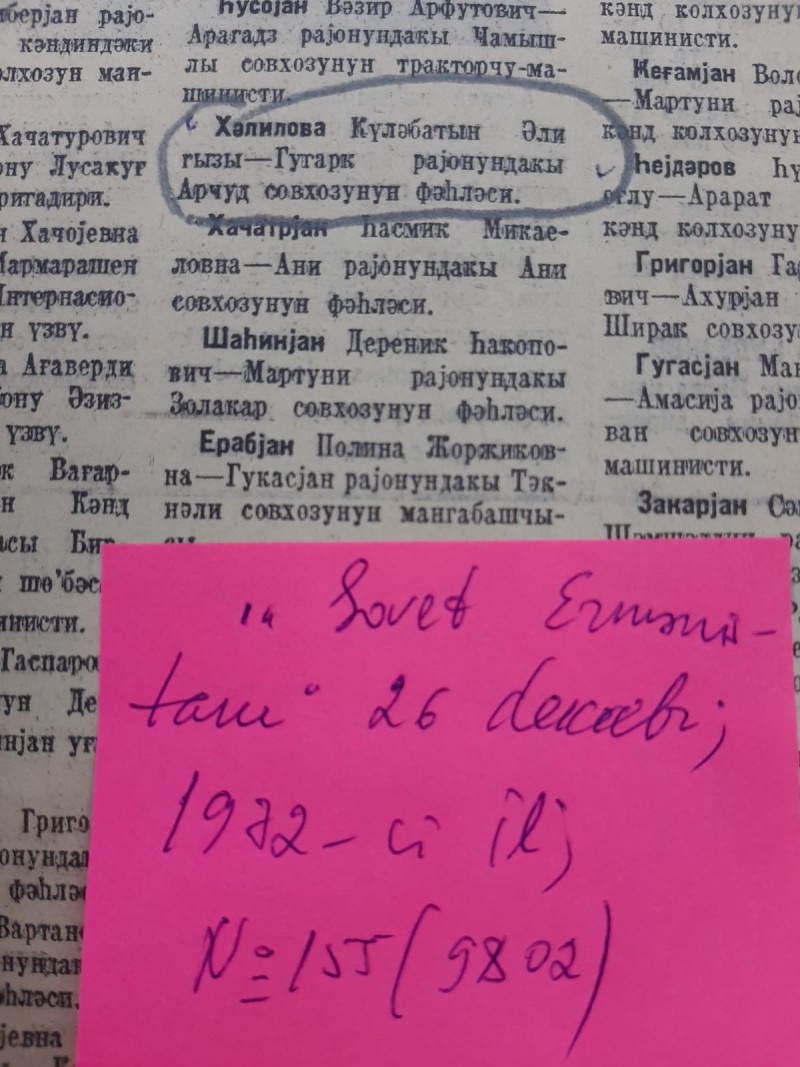 Qəzetin 26 dekabr 1972-ci il tarixli, N155 (9802) sayında Ermənistan SSR kənd təsərrüfatı qabaqcıllarının SSRİ orden və medalları ilə təltif edilməsi haqqında SSRİ Ali Soveti Rəyasət Heyətinin 14 dekabr 1972-ci tarixli Fərmanının mətni dərc olunmuşdur. Həmin fərmana əsasən, Quqark rayonunun Arçut sovxozunun fəhləsi Xəlilova Güləbatın Əli qızı “Əmək igidliyinə görə” medalı ilə təltif olunub.