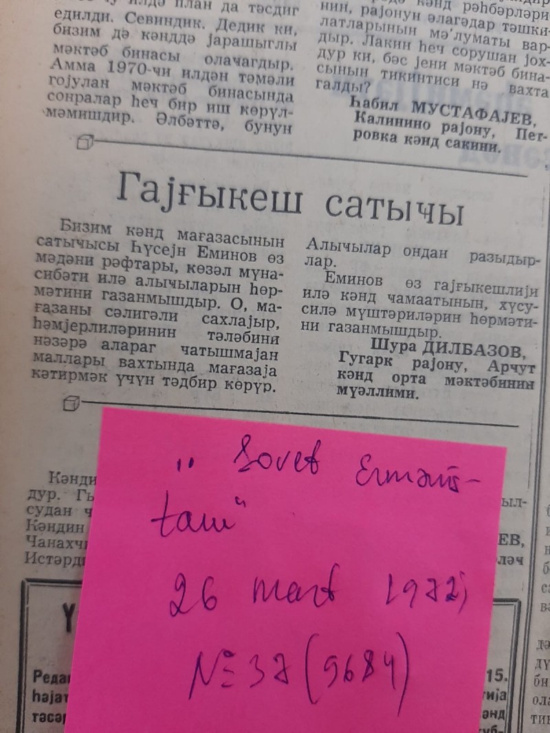 Qəzetin 26 mart 1972-ci il tarixli, N37 (9684) sayında Quqark rayonu, Arcut kənd orta məktəbinin müəllimi Şura Dilbazovun imzası ilə dərc olunan, “Qayğıkeş satıcı” başlıqlı yazıda bu kimi fikirlər qərarlaşırdı: “ Bizim kənd mağazasının satıcısı Hüseyn Eminov öz mədəni rəftarı, gözəl münasibəti ilə alıcıların hörmətini qazanmışdır. O, mağazanı səliqəli saxlayır, həmyerlilərinin tələbini nəzərə alaraq çatışmayan malları vaxtında mağazaya gətirmək üçün tədbir görür. Alıcılar ondan razıdırlar. Eminov öz qayğıkeşliyi ilə kənd camaatının, xüsusilə müştərilərin hörmətini qazanmışdır”.