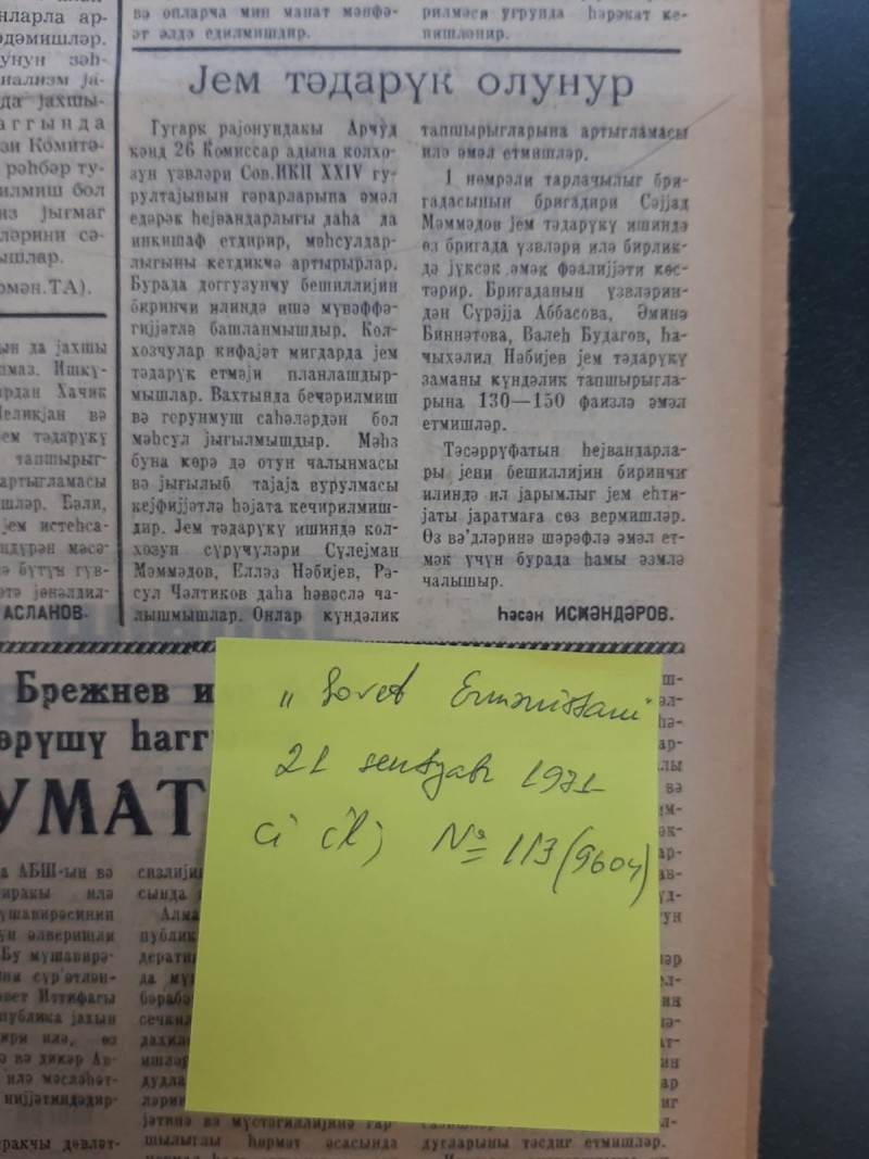 Qəzetin 21 sentyabr 1971-ci il tarixli, N113 (9604) sayında, Həsən İsgəndərovun imzası ilə dərc olunan, “Yem tədarük olunur” başlıqlı yazıda bu kimi sətirlərə rast gəlinirdi: “Quqark rayonundakı Arcud kənd 26 Komissar adına kolxozun üzvləri Sov. İKP XXIV qurultayının qərarlarına əməl edərək heyvandarlığı daha da inkişaf etdirir, məhsuldarlığını getdikcə artırırlar. Burada doqquzuncu beşilliyin birinci ilində işə müvəffəqiyyətlə başlanmışdır. Koxozçular kifayət miqdarda yem tədarük etməyi planlaşdırmışlar. Vaxtında becərilmiş və qorunmuş sahələrdən bol məhsul yığılmışdır. Məhz buna görə də otun çalınması və yığılıb tayaya vurulması keyfiyyətlə həyata keçirilmişdir. Yem tədarükü işində kolxozun sürücüləri Süleyman Məmmədov, Elləz Nəbiyev, Rəsul Çəltikov daha həvəslə çalışmışlar. Onlar gündəlik tapşırıqlarına artıqlaması ilə əməl etmişlər. 1 nömrəli tarlaçılıq briqadasının briqadiri Səyyad Məmmədov yem tədarükü işində öz briqada üzvləri ilə birlikdə yüksək əmək fəaliyyəti göstərir. Briqadanın üzvlərindən Sürəyya Abbasova, Əminə Binnətova, Valeh Budaqov, Hacıxəlil Nəbiyev yem tədarükü zamanı gündəlik tapşırıqlarına 130-150 faizlə əməl etmişlər. Təsərrüfatın heyvandarları yeni beşilliyin birinci ilində il yarımlıq yem ehtiyatı yaratmağa söz vermişlər. Öz vədlərinə şərəflə əməl etmək üçün burada hamı əzmlə çalışır”.