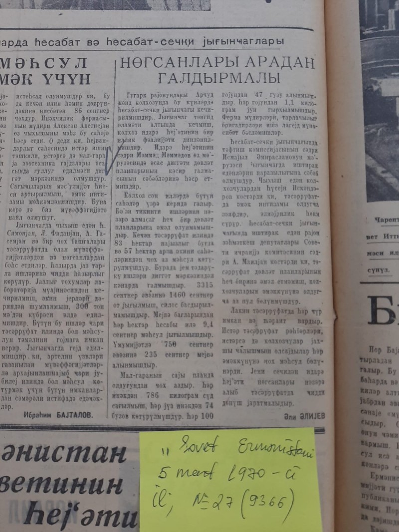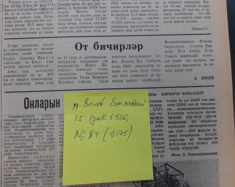 Qəzetin 15 iyul 1971-ci tarixli, N84(9575) sayında, Ə.Əliyevin imzası ilə dərc olunan, “Ot biçirlər” başlıqlı məqalədə yazılırdı: “Quqark rayonunun kolxoz və sovxozlarında ot çalını nümunəvi davam etdirilir. Rayonun Lernabad, Jdanov sovxozları və Arcud kənd kolxozu irəlidə gedirlər. Arcud kənd kolxozunun zəhmətkeşləri bu il 680 ton ot tədarük etməlidirlər. Artıq indiyədək demək olar ki, bu qədər ot yığılmışdır. Arcudlular ilyarımlıq yem toplayacaqlar. Şəmil Şərifovun başçılıq etdiyi tarlaçılıq briqadasının üzvlərindən Qasım Məmmədov, Məhəmməd Səfərov, Səyyad Alıyevin briqadasından isə İsa Əhmədov, İsa Qurbanov, gündə 5000 kvadratmetr sahədən çox yerin otunu biçirlər. Otun daşınması da nümunəvi təşkil olunmuşdur. Mexanizatorlardan İsmayıl Əmiraslanov, Süleyman Məmmədov, Vəli Alıyev, Elləz Rəfiyev maşınları müntəzəm olaraq saz saxlayır və fasiləsiz işlədirlər. Ot biçini davam edir”.