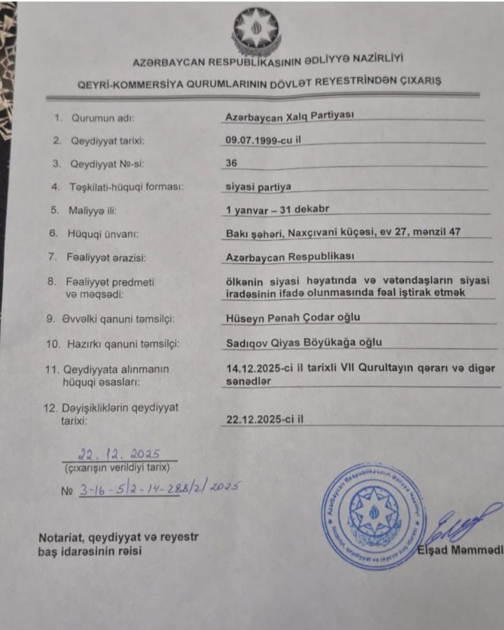 Bakıvaxtı.az xəbər verir ki, Ədliyyə Nazirliyinin qeyri-kommersiya qurumlarının dövlət reyestrinə edilən dəyişikliklərə əsasən, AXP-nin yeni qanuni təmsilçisi Qiyas Sadıqov olub.