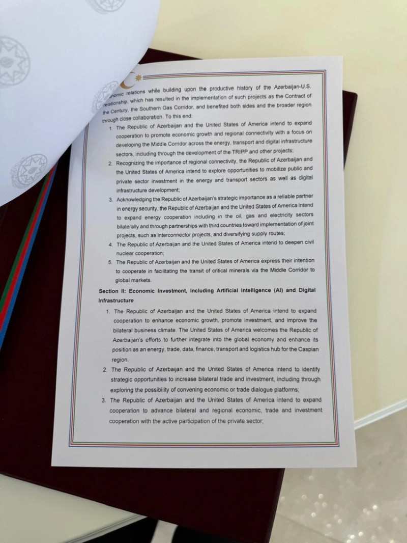 - Azərbaycan Respublikası və Amerika Birləşmiş Ştatları AI tərəfdaşlıqlarının inkişaf etdirilməsi üzrə əməkdaşlığı genişləndirmək və müvafiq hallarda, kosmik sənaye sahəsində əməkdaşlığı və Azərbaycan Respublikasında özəl sektorla əməkdaşlıq ilə AI data mərkəzlərinin inkişafı da daxil olmaqla, rəqəmsal infrastruktura sərmayə qoyuluşunu təşviq etmək niyyətindədirlər;
