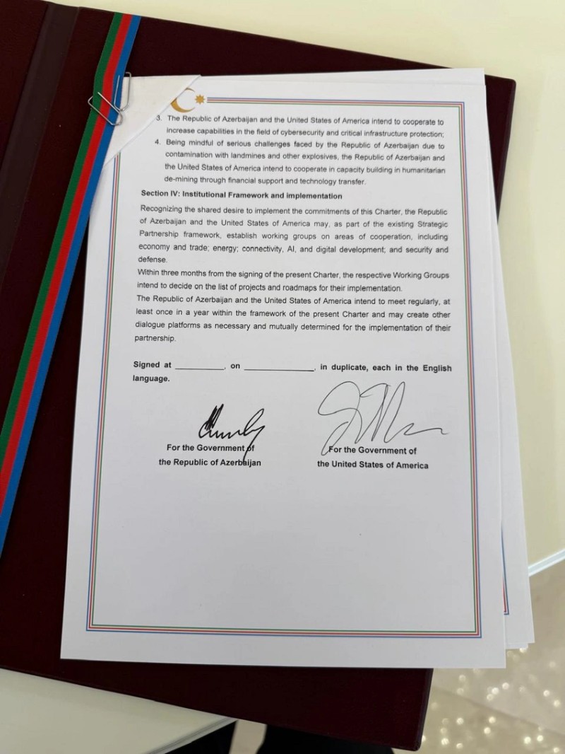 Bakıvaxtı.az-ın məlumatına görə, "Azərbaycan Respublikası Hökuməti ilə Amerika Birləşmiş Ştatları Hökuməti arasında Strateji Tərəfdaşlıq Xartiyası"nı Azərbaycan tərəfindən Prezident İlham Əliyev, ABŞ tərəfindən isə vitse-prezident Cey Di Vens imzalayıblar.