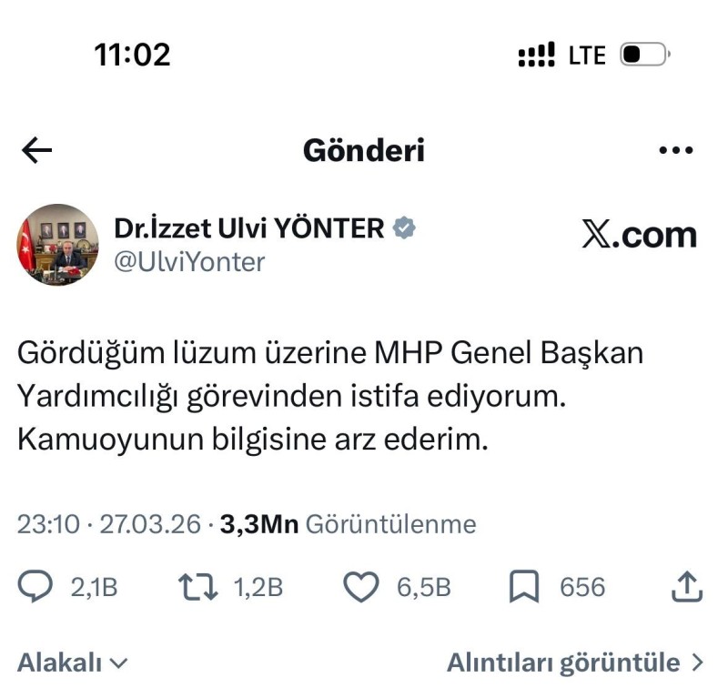Türkiyənin Milliyətçi Hərəkət Partiyasının sədrinin müavini İzzət Ülvi Yönter sosial şəbəkədə paylaşdığı mübahisəli mesajlardan sonra vəzifəsindən istefa verdiyini açıqlayıb.