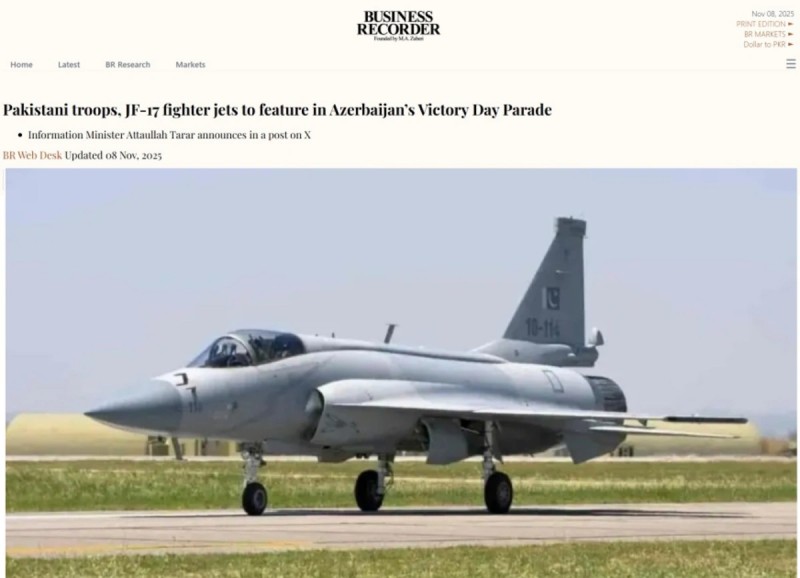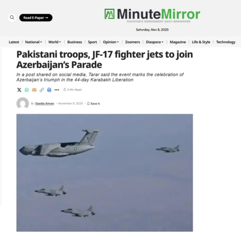Pakistanın aparıcı media qurumları, o cümlədən "ARN News Centre", "AAJ News (AAJ TV)", "The Express Tribune", "Brecorder", "Geo News", "24 News HD", "Minute Mirror", "Lead Pakistan", "Dawn" televiziya və nəşrlərinin yayımladığı xəbərlərdə Hərbi paradın möhtəşəmliyi, Azərbaycan, Türkiyə və Pakistan hərbi qüvvələrinin birgə iştirakı, nümayiş olunan hərbi texnika və aviasiya qüvvələri barədə məlumat verilib. Xüsusi diqqət Azərbaycan Prezidentinin çıxışına yönəldilib, dövlətimizin başçısının Türkiyə və Pakistanın Vətən müharibəsi zamanı Azərbaycana qətiyyətli dəstəyi barədə fikirləri geniş işıqlandırılıb. Həmçinin, Prezident İlham Əliyevin Azərbaycanın ədalətli mübarizəsi zamanı göstərdiyi möhkəm dəstəyə görə Pakistana təşəkkür etdiyi, rəsmi İslamabadın Cənubi Asiyada regional sabitliyin təmin edilməsindəki rolunu yüksək qiymətləndirdiyi vurğulanıb. Xəbərlərdə Pakistanın Baş naziri Məhəmməd Şahbaz Şərifin paradda iştirakı xüsusi qeyd olunub, üç qardaş ölkənin ordularının sıx əməkdaşlığı diqqətə çatdırılıb. Pakistan mediasında paradın regional əməkdaşlıq və Cənubi Qafqazda sülh və sabitliyin güclənməsi baxımından əhəmiyyətini də ön plana çıxardığı qeyd olunub. "The Express Tribune" nəşri bu baxımdan Pakistan Baş nazirinin Hərbi paraddakı çıxışında "Bu, dostluq və regional həmrəyliyin əyani göstəricisidir" ifadəsini xüsusi vurğulayıb.