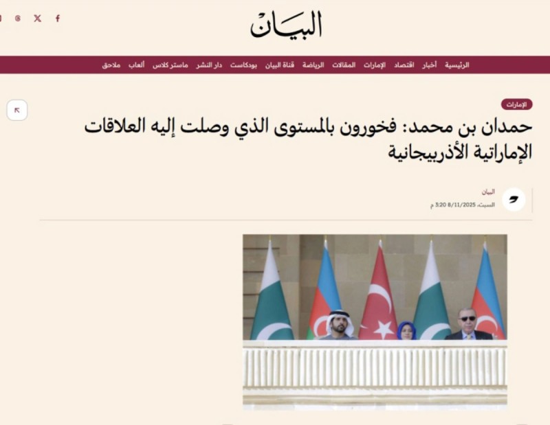Birləşmiş Ərəb Əmirliklərinin aparıcı media qurumları da, o cümlədən "ARN News Centre", "UAE BARQ", "Emarat Al Youm", "Al Bayan", "Sharjah24" və "20Four" portalları Vətən müharibəsində Qələbənin beşinci ildönümünə həsr olunmuş Hərbi paradı geniş işıqlandırıb. Xəbərlərdə Bakıda keçirilən Hərbi paradın möhtəşəmliyi, nümayiş etdirilən hərbi texnika və Azərbaycan Ordusunun hərbi qüdrəti barədə ətraflı məlumat verilib. Xüsusi diqqət Azərbaycan Prezidenti İlham Əliyevin, Türkiyə Prezidenti Rəcəb Tayyib Ərdoğanın və Pakistanın Baş naziri Məhəmməd Şahbaz Şərifin paraddakı çıxışlarında səsləndirdiyi fikirlərə yönəldilib. Materiallarda Azərbaycan və Türkiyə liderlərinin regional əməkdaşlıq, Cənubi Qafqazda sülh və sabitliyin təmin olunması barədə bəyanatları da yer alıb.