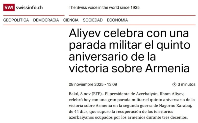İspaniyanın EFE agentliyi də Hərbi parada xüsusi diqqət ayırıb. Agentliyin yayımladığı xəbərdə İkinci Qarabağ müharibəsində Qələbənin beşinci ildönümünə həsr olunan Hərbi paradda Türkiyə və Pakistan liderlərinin də iştirakı vurğulanıb. Xəbərdə əsasən Azərbaycan və Türkiyə prezidentlərinin, Pakistan Baş nazirinin fikirləri diqqətə çatdırılıb, liderlərin Azərbaycanın Qələbəsinin regionda sülh, inkişaf və əmin-amanlıq üçün yeni səhifə açması barədə fikirləri qeyd olunub. Bu xəbər İsveçrənin "Swissinfo.ch" nəşri tərəfindən də EFE-yə istinad olunaraq yayımlanıb.