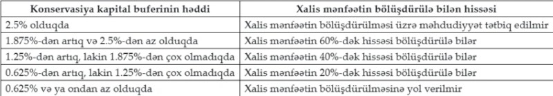 Həmçinin bank tərəfindən konservasiya kapital buferi bu Qaydaların 8-2.1-ci bəndində müəyyən edilmiş həddən aşağı düşdükdə mükafat və dividend ödənişi, o cümlədən aralıq dividend ödənişi aşağıdakı cədvəldə müəyyən edilmiş qaydada məhdudlaşdırılır: