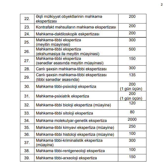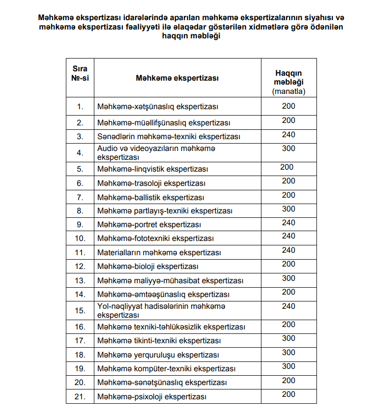 Qərara əsasən, “Məhkəmə ekspertizası idarələrində aparılan məhkəmə ekspertizalarının siyahısı və məhkəmə ekspertizası fəaliyyəti ilə əlaqədar göstərilən xidmətlərə görə ödənilən haqqın məbləği” təsdiq edilib.