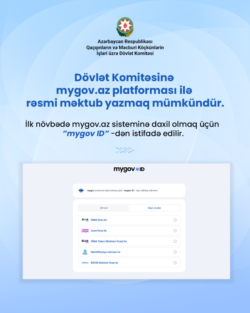 Qeyd edək ki, indiyədək ərizə, müraciət, təkliflərlə bağlı vətəndaşlar poçt, elektron resurslar ( elektron poçt, Dövlət Komitəsinin rəsmi facebook və instagram hesablarının mesaj bölməsi), yaxud müvəqqəti qeydiyyatda olduqları rayonlar üzrə komitənin nümayəndəlikləri vasitəsi ilə komitəyə müraciət edirdilər. “MyGov” platformasına inteqrasiya vətəndaşlara, heç bir yerə getmədən, internet üzərindən müraciət etmək və cavab almaq imkanı verir. Bunun üçün “myGov” portalında şəxsi kabinetə 5 üsuldan birini seçməklə ( “İdentifikasiya nömrəsi ilə”, “SİMA Rəqəmsal İmza”, “SİMA Token (Elektron İmza)”, “ASAN İmza”, “Elektron İmza”, “BSXM – Elektron İmza”) daxil olmaq mümkündür.