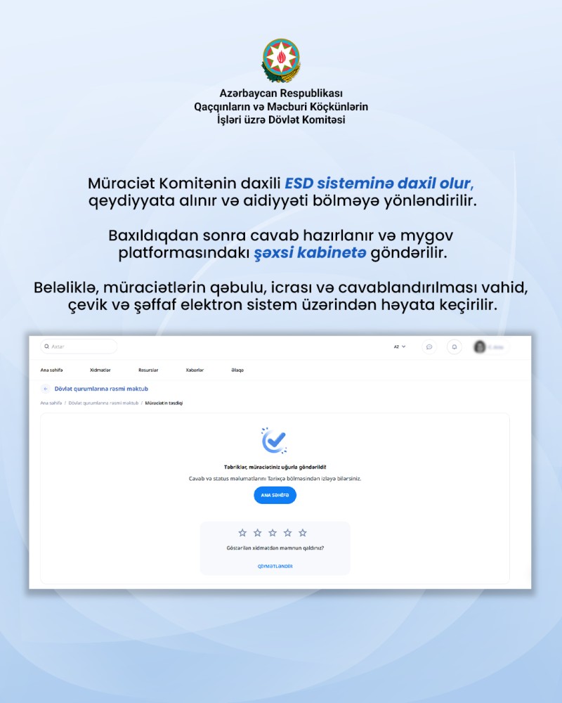 “Azərbaycanın yeni rəqəmsal arxitekturası” adlı vahid fəaliyyət planına həsr olunmuş müşavirədə Prezident İlham Əliyevin dövlət xidmətlərinin “myGov” elektron hökumət portalı üzərindən həyata keçirilməsi ilə bağlı verdiyi tapşırığa uyğun olaraq, Qaçqınların və Məcburi Köçkünlərin İşləri üzrə Dövlət Komitəsi də məqsədyönlü iş aparır. Nəticədə məmur-vətəndaş təması aradan qaldırılır, şəffaflıq mühiti yaradılır.