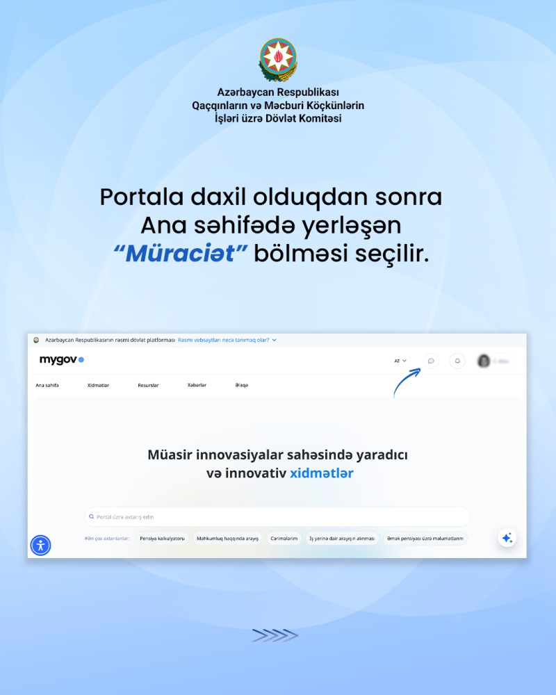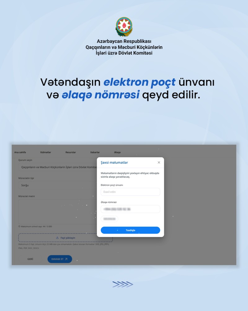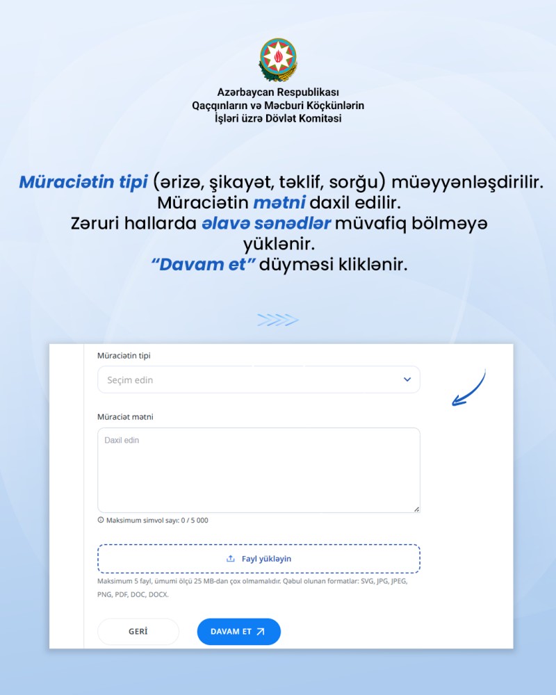 Portala daxil olduqdan sonra Ana səhifədə yerləşən müraciət bölməsindən “Dövlət qurumlarına müraciət” seçilir. Açılan bölmədə “Müraciət et” düyməsi klik edilir. Dövlət qurumlarının siyahısından Qaçqınların və Məcburi Köçkünlərin İşləri üzrə Dövlət Komitəsi seçilir, “müraciətin tipi” - ərizə, şikayət, təklif, sorğu - müəyyənləşdirilir. Daha sonra müraciət mətni daxil edilir. Müraciətə əlavə edilməsi istənilən digər sənədlərin zəruri bölməyə yükləndikdən sonra “Davam et” düyməsi seçilir. Bu zaman vətəndaşın fərdi elektron poçt ünvanı və əlaqə nömrəsi qeyd edilir.
