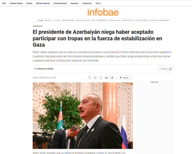 İspaniyanın “Communicacion” portalının Azərtac-a istinadla dərc etdiyi materiallarda qeyd olunub ki, Prezident İlham Əliyev Azərbaycan hərbçilərinin ölkənin hüdudlarından kənarda heç bir hərbi əməliyyatlarda iştirak etmədiyini və bunun gələcəkdə də nəzərdə tutulmadığını bildirib. İspan saytı bununla bağlı yanlış məlumatları təkzib edən dövlətimizin başçısının sözlərini sitat gətirir: “Biz 20 sualdan ibarət müraciət tərtib etdik və onu Amerika tərəfinə çatdırdıq. Bu məsələlərə aydınlıq gətirilməyincə, Azərbaycanın hər hansı missiyada heç bir iştirakı nəzərdə tutulmur”.