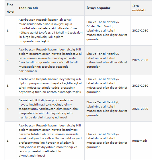 "Beynəlxalq ikili diplom proqramlarının həyata keçirilməsi üzrə Tədbirlər Planı” təsdiq edilib.Bakıvaxtı.az xəbər verir ki, bu barədə Baş nazir Əli Əsədov sərəncam imzalayıb.Bu Sərəncam imzalandığı gündən qüvvəyə minir.