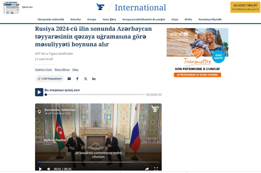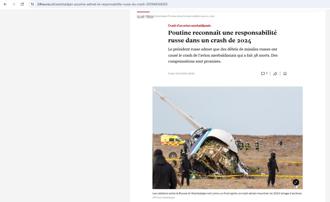 akıvaxtı.az “LeFigaro.fr”ə istinadən xəbər verir ki, bu məlumat “LeFigaro.fr” saytında “Rusiya 2024-cü ilin sonunda Azərbaycan təyyarəsinin qəzaya uğramasına görə məsuliyyəti boynuna alır” başlığı altında paylaşılıb. Xəbərdə deyilir ki, Rusiya prezidenti Vladimir Putin azərbaycanlı həmkarı İlham Əliyevlə söhbətində 2024-cü ilin sonlarında zenit raketlərinin dağıntılarına məruz qalan “Azərbaycan Hava Yolları”na məxsus təyyarənin qəzaya uğramasına görə Rusiyanın məsuliyyət daşıdığını etiraf edib. Bakıdan Qroznıya uçan təyyarə 2024-cü il dekabrın 25-də qəzaya uğrayıb.