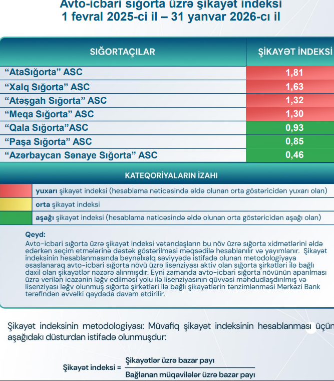 Digər sığorta şirkətləri üzrə şikayət indeksi aşağıdakı kimidir: