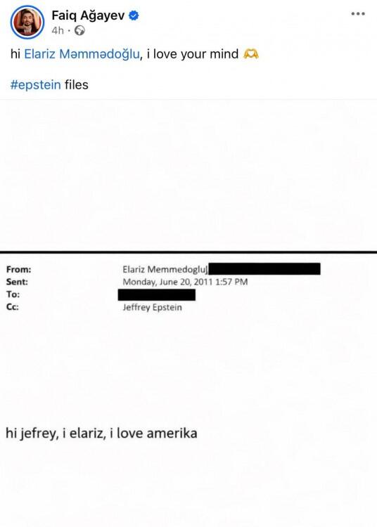 Bakıvaxtı.az xəbər verir ki, paylaşımda Elarizin onlarla azyaşlı qızın istismar edildiyi şəbəkə ilə bağlı ittiham olunan milyarder Ceffri Epşteynə yazdığı elektron məktub yer alıb. Məktub 2011-ci ilə aid olub.