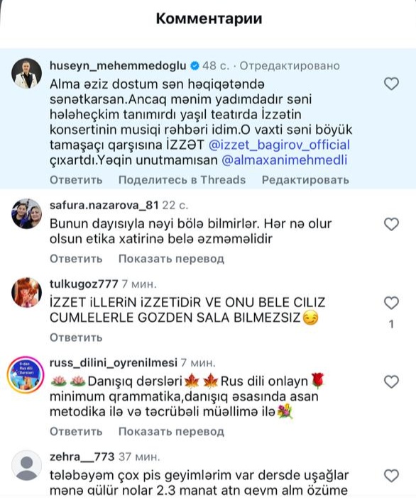 "Almaxanım, əziz dostum! Sən həqiqətən də sənətkarsan. Səni hələ heç kim tanımırdı, amma mənim yaxşı yadımdadır, Yaşıl Teatrda İzzətin konserti olanda, mən də orada musiqi rəhbəri idim. O vaxt səni böyük tamaşaçı qarşısına məhz İzzət çıxarmışdı. Yəqin ki, unutmamısan?”/Azxeber