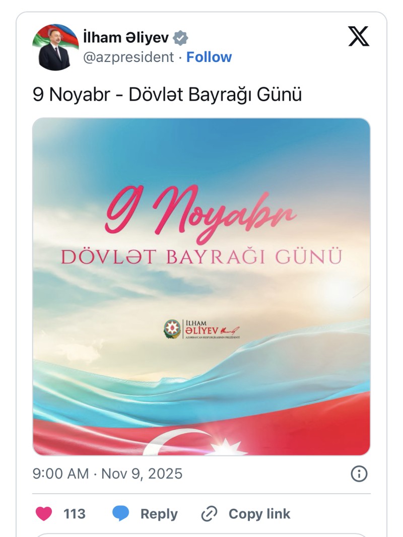 Azərbaycan Prezidenti İlham Əliyev sosial şəbəkə hesablarında 9 Noyabr - Dövlət Bayrağı Günü münasibətilə paylaşım edib.Bakıvaxtı.az paylaşımı təqdim edir: