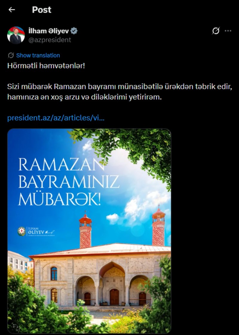 Azərbaycan Prezidenti İlham Əliyev sosial şəbəkə hesabında Ramazan bayramı münasibətilə paylaşım edib.