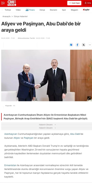 Həmçinin bildirilib ki, Azərbaycan Prezidenti İlham Əliyev və Ermənistanın Baş naziri Nikol Paşinyan fevralın 4-də Birləşmiş Ərəb Əmirliklərinin paytaxtı Əbu-Dabidə 2026-cı il “Zayed İnsan Qardaşlığı Mükafatı”nın təqdimolunma mərasimində iştirak ediblər. Mükafat bu il hər iki liderə təqdim olunub.