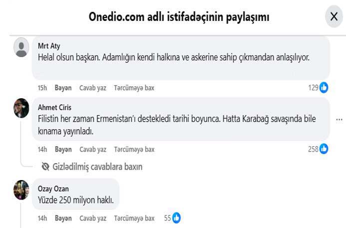 Bu paylaşımlardan və onlara yazılan şərhlərdən aydın olur ki, İsrail-Fələstin məsələsi, eləcə də Qəzza ilə bağlı Azərbaycanın tutduğu mövqeyə əvvəlki tənqidi yanaşmalar xeyli zəifləyib, Türkiyə ictimai fikrində dəyişiklik baş verib.