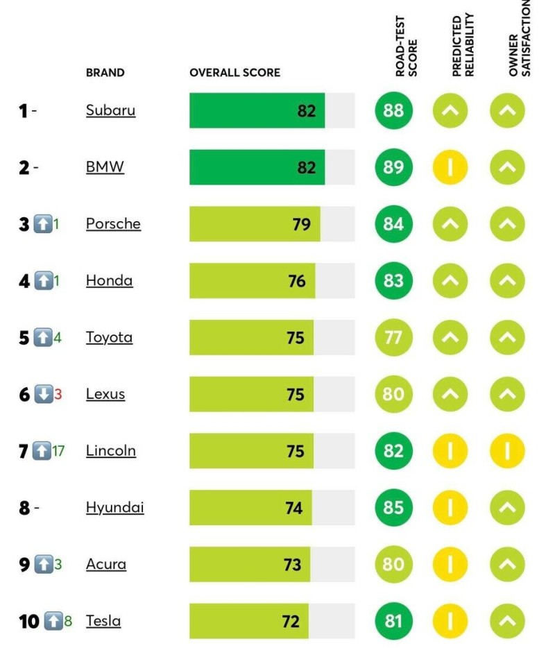 Ən çox irəliləyənlər: Lincoln 17 pillə yüksələrək 7-ci yerə qalxıb, Toyota top-5-ə daxil olub, Porsche və Honda isə bir pillə irəliləyib. Hyundai 8-ci yerdə qalıb, Acura və Tesla top-10-a daxil olub.