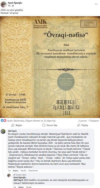 Azad Ağaoğlu isə onun şərhinə cavab olaraq bu sözləri yazıb: “Akif müəllim, öz aramızdır, axı sizin elədiyiniz transliterasiyadan nə olacaq? Güldürməyin də adamı”.