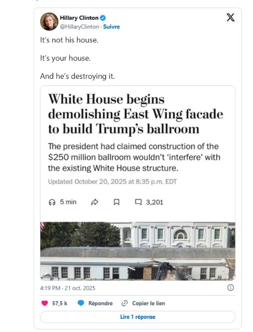 Bakıvaxtı.az “LeFigaro.fr”ə istinadən xəbər verir ki, H. Klinton özünün “X” hesabında qeyd edib: “Bu, onun evi deyil. Bu, sizin evinizdir. Və o, onu məhv edir".