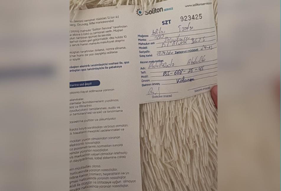"Belə hallarla qarşılaşan istehlakçının bu barədə Azərbaycan Respublikasının Prezidenti yanında Antiinhisar və İstehlak Bazarına Nəzarət Dövlət Agentliyinin Aparatına məlumat vermələrini tövsiyə edirəm. Müştərilər möhürlü və imzalı formada zəmanət talonunu almalı, çeklə birgə uzun müddət saxlamalıdır".