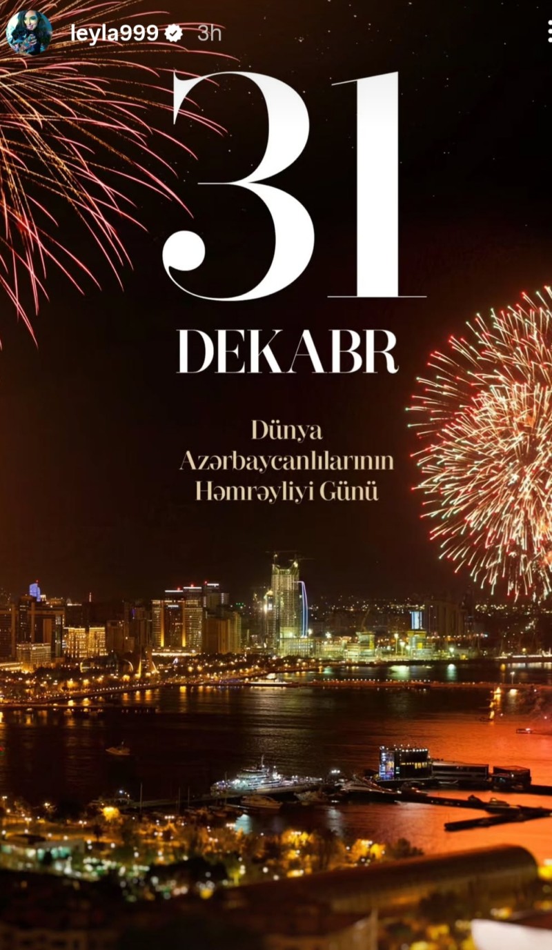 Heydər Əliyev Fondunun vitse-prezidenti, İDEA İctimai Birliyinin təsisçisi və rəhbəri Leyla Əliyeva "İnstaqram" hesabında Yeni il və 31 Dekabr Dünya Azərbaycanlılarının Həmrəylik Günüylə bağlı paylaşım edib.