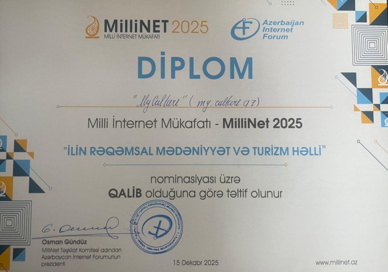 Azərbaycan Respublikası Mədəniyyət Nazirliyinin “MyCulture” Vahid Şəxsi Kabineti (https://my.culture.az) “MilliNet 2025” milli internet müsabiqəsinin “İlin rəqəmsal mədəniyyət və turizm həlli” nominasiyası üzrə qalibi seçilib.