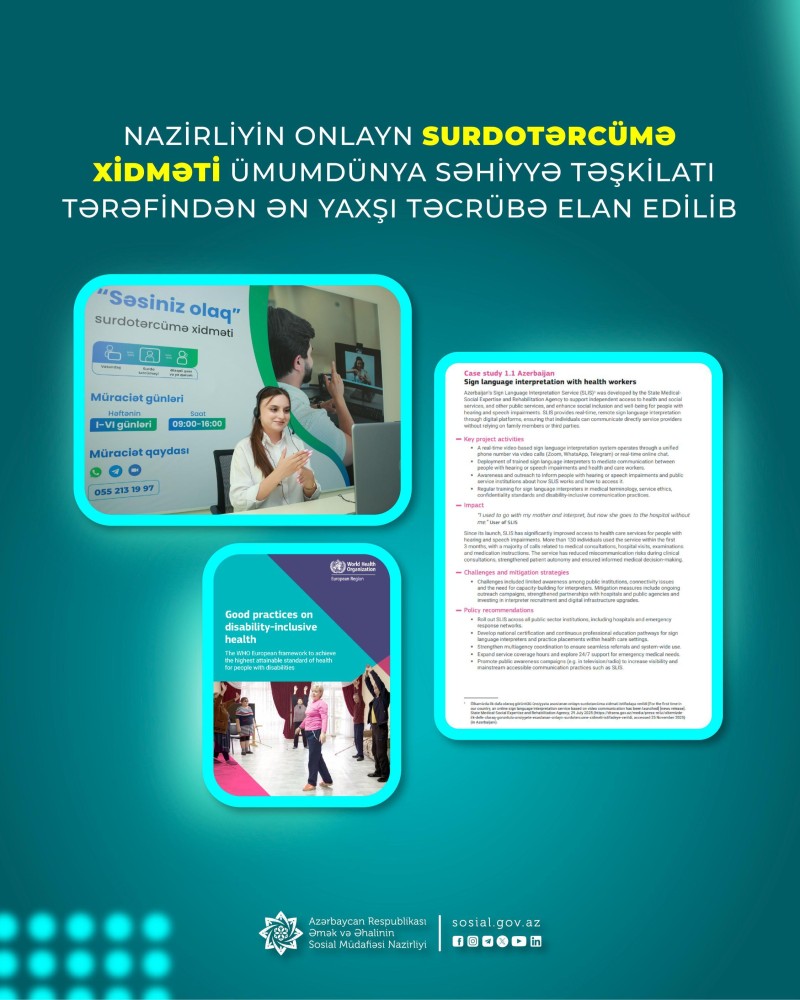 Əmək və Əhalinin Sosial Müdafiəsi Nazirliyinin tabeliyində Dövlət Tibbi-Sosial Ekspertiza və Reabilitasiya Agentliyinin “Səsiniz olaq” onlayn surdotərcümə xidməti Ümumdünya Səhiyyə Təşkilatı tərəfindən ən yaxşı təcrübə elan edilib.