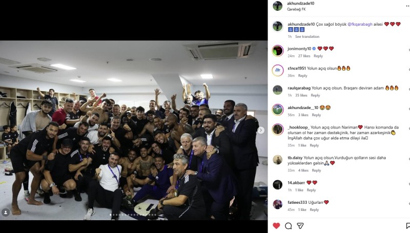 21 yaşlı forvard şəkillər paylaşıb və “çox sağ ol, böyük “Qarabağ” ailəsi” başlığını yazıb.