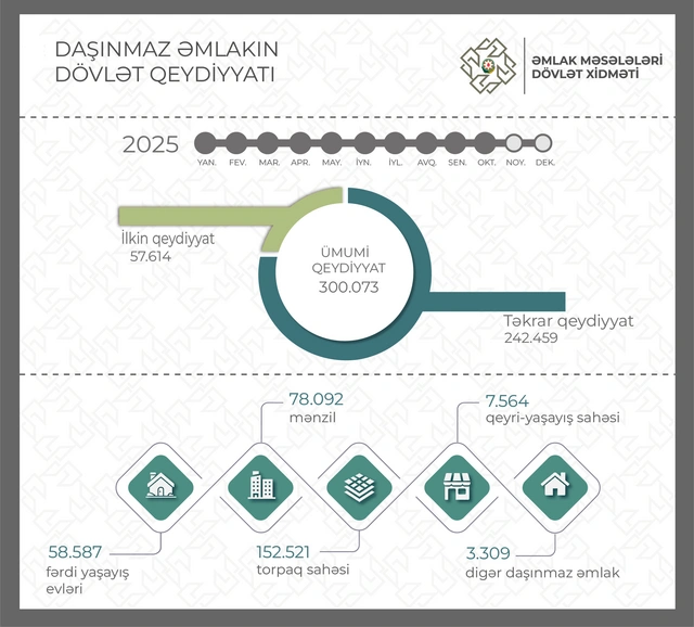 2025-ci ilin yanvar-oktyabr ayları ərzində İqtisadiyyat Nazirliyi yanında Əmlak Məsələləri Dövlət Xidməti tərəfindən daşınmaz əmlak üzərində 300 min 73 mülkiyyət hüququ qeydiyyata alınaraq çıxarışla ("kupça") təmin edilib.