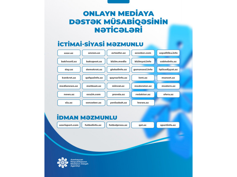 Azərbaycan Respublikasının Medianın İnkişafı Agentliyi tərəfindən onlayn media subyektlərinin (veb-saytların) inkişafı, iqtisadi müstəqilliyinin gücləndirilməsi, fəaliyyətinin təkmilləşdirilməsi, habelə dövlət və cəmiyyət üçün əhəmiyyət kəsb edən layihələrin həyata keçirilməsi məqsədilə təşkil edilən müsabiqənin nəticələri açıqlanıb.