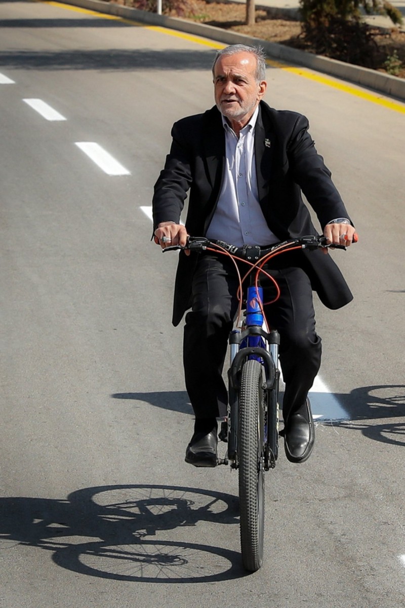 Bakıvaxtı.az xəbər verir ki, Pezeşkian bir neçə mühafizəçisi və yaxın müşavirləri ilə sadə vətəndaşlarla eyni yolda velosiped sürüb.