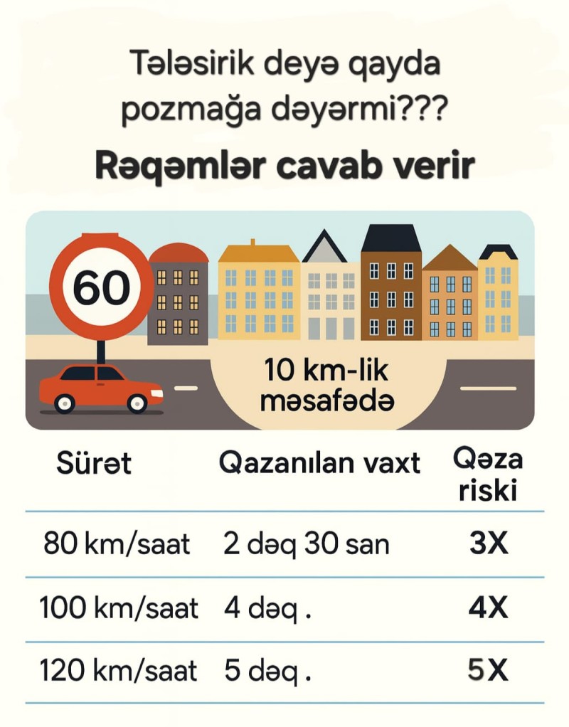 “Yollarda sürət həddinin aşılması çox vaxt “bir az tez çatmaq” düşüncəsi ilə əsaslandırılır. Lakin real rəqəmlərə baxdıqda bunun heç bir ciddi üstünlük vermədiyi aydın görünür. Məsafəni daha yüksək sürətlə qət etdikdə 10 kilometrlik məsafədə qazandığınız vaxt cəmi bir neçə dəqiqədən artıq olmur”.