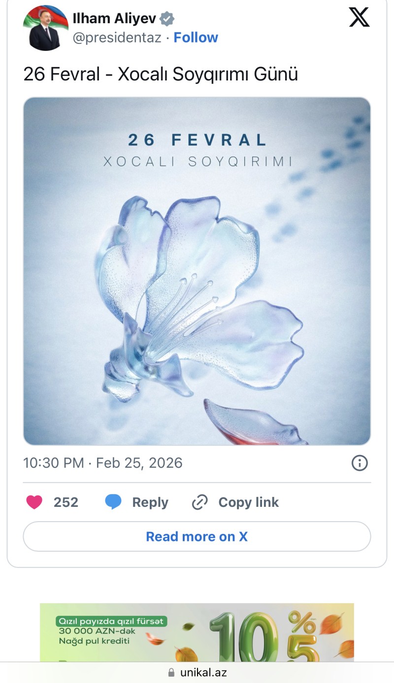 Azərbaycan Prezidenti İlham Əliyevin sosial şəbəkə hesablarında Xocalı faciəsinin 34-cü ildönümü ilə bağlı paylaşım edilib.Bakıvaxtı.az paylaşımı təqdim edir: