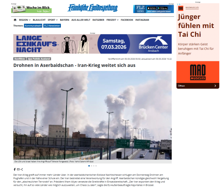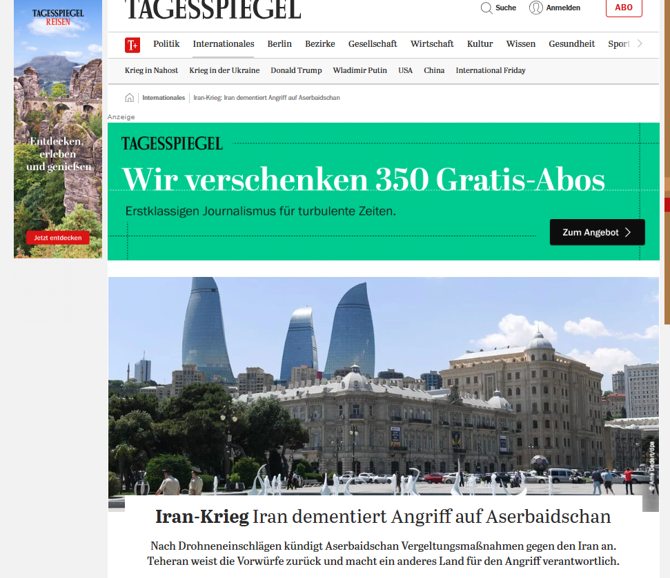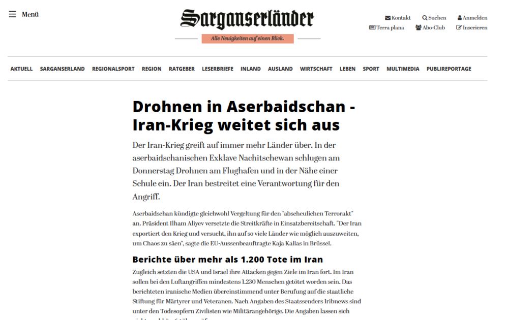“Morgenpost”, “Börsen News”, “FLZ. News”, Tagesspiegel”, “Frankfurter Rundschau”, “Wirthschau Woche”, “Die Zeit”, “Ad Hoc News”, Cash”, Sarganserlander”, “Ostfriezen Zeitung” qəzet və portallarının materiallarında Azərbaycanın Naxçıvan Muxtar Respublikasında aeroportun, məktəb binasının və digər mülki obyektlərin dron hücuma məruz qaldığı diqqətə çatdırılıb. Qeyd olunub ki, Prezident İlham Əliyevin sədrliyi ilə keçirilən Təhlükəsizlik Şurasının iclasında bu hücum sərt şəkildə pislənilib, həmçinin İran səfiri insidentlə bağlı Azərbaycan Xarici İşlər Nazirliyinə çağırılıb. Azərbaycan lideri İranın hücumunu “terror aktı” adlandırıb və onun göstərişi ilə Azərbaycan Silahlı Qüvvələri yüksək döyüş hazırlığına gətirilib.