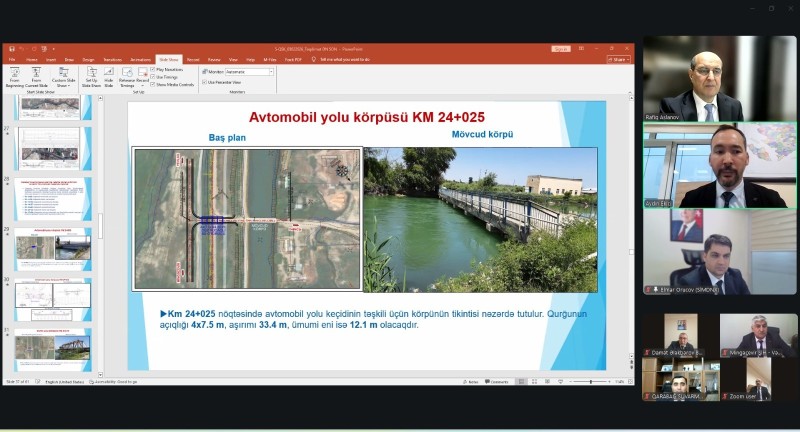 Daha sonra Azərbaycan Dövlət Su Ehtiyatları Agentliyinin tabeliyində olan layihə institutu və layihəyə cəlb edilmiş PROYAPI və TEMELSU şirkətlərinin mütəxəssisləri tərəfindən birgə hazırlanmış layihə sənədlərinin cari vəziyyəti barədə təqdimat keçirilib. Təqdimatda Qarabağ suvarma kanalının 26 km-lik 1-ci hissəsinin layihə-smeta sənədlərinin yekunlaşmaq üzrə olduğu bildirilərək, Qarabağ, Mil və Muğan düzlərində aqrar-sənaye komplekslərinin inkişaf perspektivləri nəzərə alınmaqla layihənin mümkün variantlarının araşdırılmasının tamamlandığı vurğulanıb.