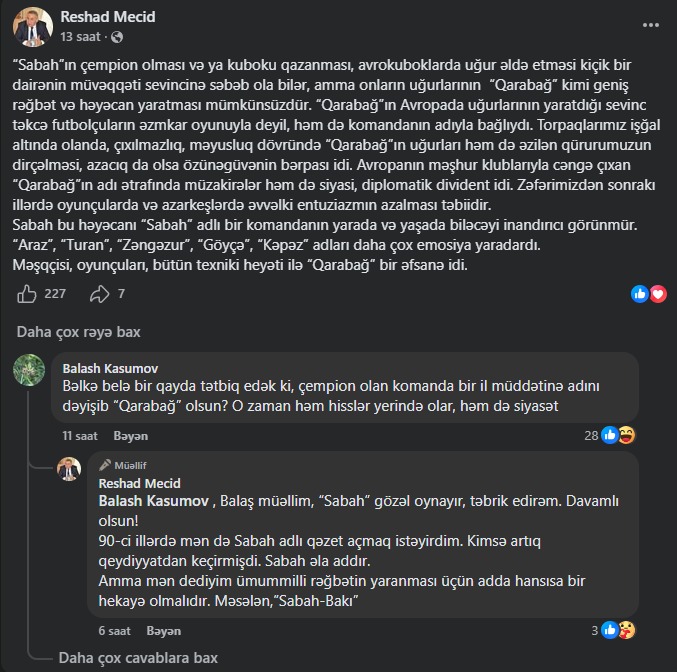 AFFA-nın vitse-prezidenti Balaş Qasımovun Rəşad Məcidin bu paylaşımına yazdığı şərh də maraqla qarşılanıb: