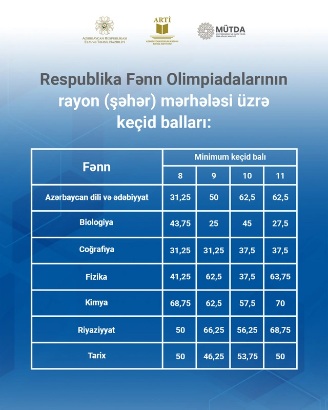 Respublika Fənn Olimpiadalarının rayon (şəhər) mərhələsinin nəticələri ilə bağlı ərizələr üç iş günü ərzində (5 fevral 17:00-a qədər) qəbul edilir. Müraciətlər [email protected] imeyl ünvanına yazılı şəkildə göndərilməlidir.