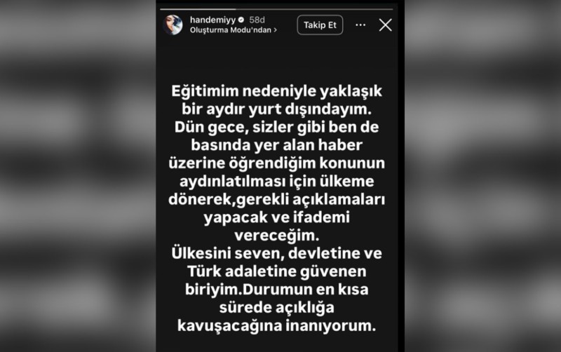 “Məsələni aydınlaşdırmaq üçün ölkəmə qayıdaraq lazımi açıqlamaları və ifadəmi verəcəyəm. Ölkəsini sevən, dövlətinə və Türk ədalətinə güvənən biriyəm. Vəziyyətin ən qısa zamanda aydınlaşacağına inanıram”.